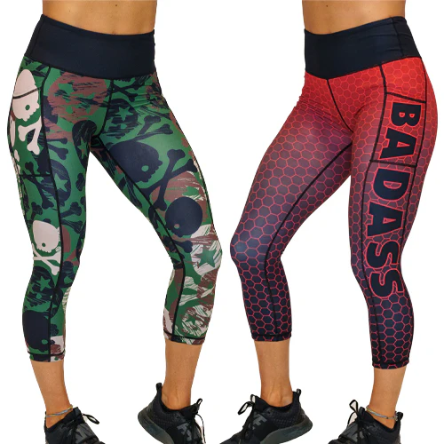 Badass Reversible Leggings flip your workout mood on command one side unleashes a hardâhitting red hex print stamped with unapologetic attitude, while the other drops into a bold camoâskull mashup for a gritty, untamed vibe.